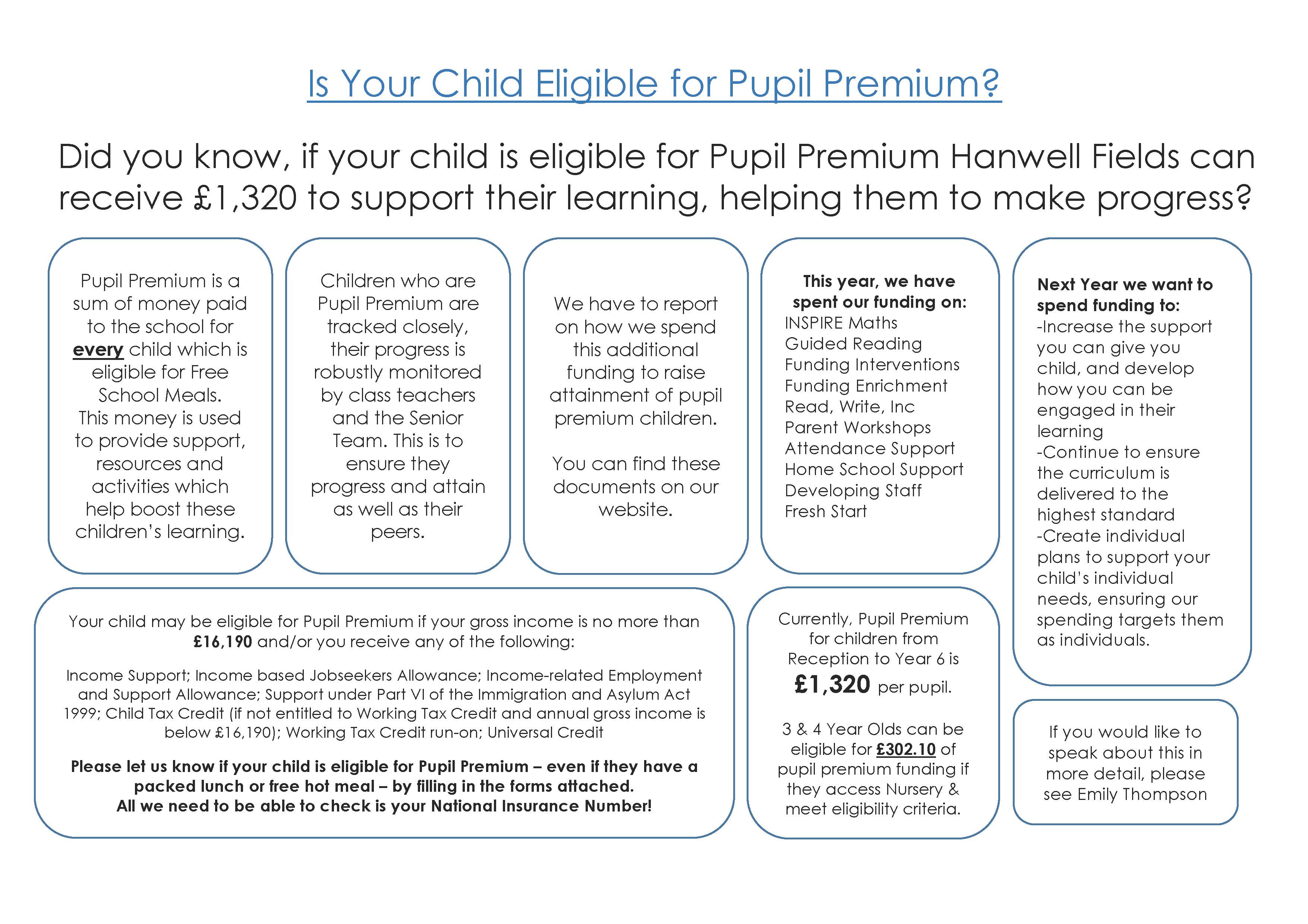 Hanwell Fields Community School receives a Pupil Premium Grant for each child who is entitled to receive Free School Meals or who has been entitled to them over the last six years, children of armed forces personnel, and for any ‘Looked After Children’, or child adopted from care. We publish online information about how we have used the premium.