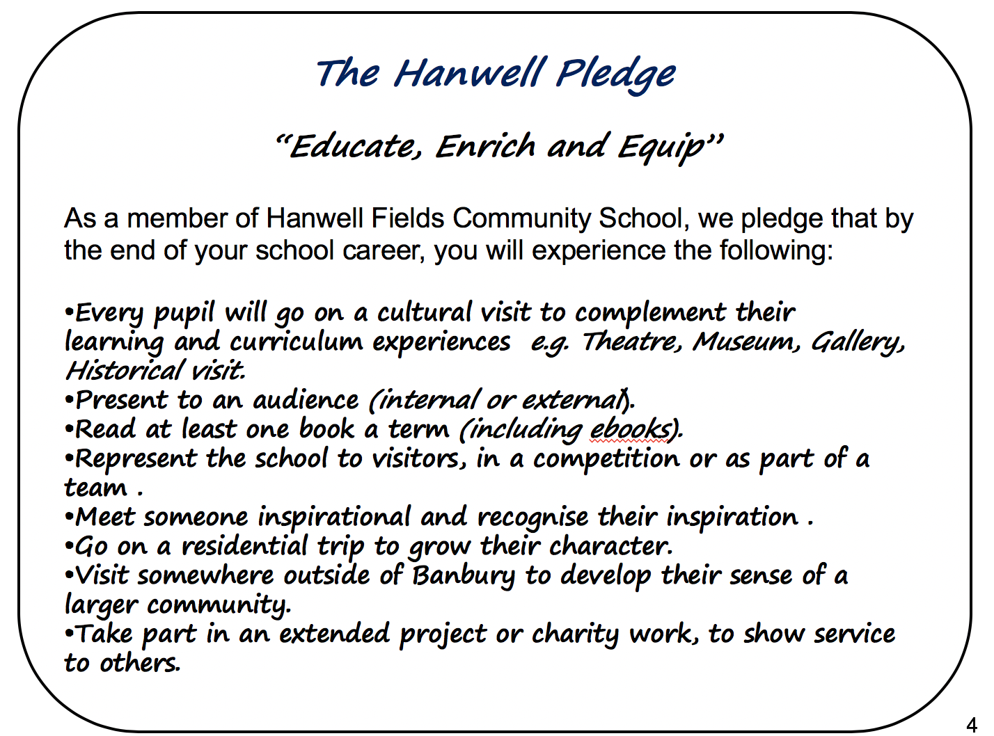 'Character is what we do when noone is looking.' Our internal values and standards guide us where there is ambiguity. We believe, at Hanwell, that we have a responsibility to develop the totality of the child. This is done through experiences and opportunities within our broad and balanced curriculum and the hidden curriculum. We have developed a pledge that we strive to achieve for every pupil during their journey at Hanwell. We believe that this will provide additional opportunities that will challenge our pupils to think deeply, develop soft skills, and push themselves academically. In turn, this will help pupils develop their character and become active citizens of the future.